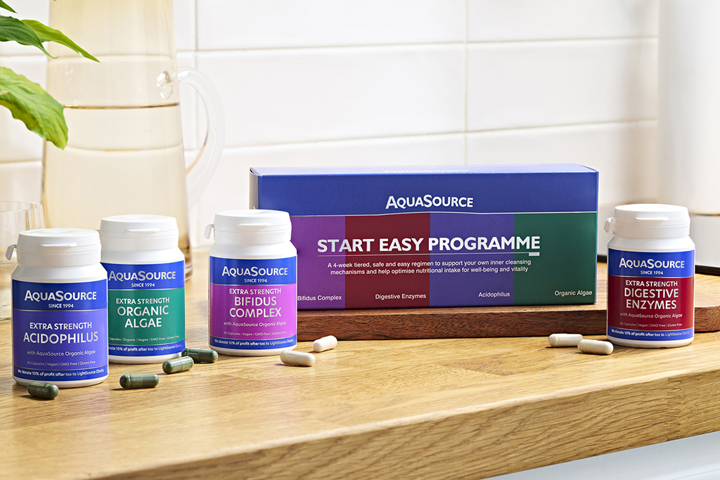 Recommended for anyone new to AquaSource nutritional supplements. The AquaSource Start Easy Programme is designed to safeguard levels of important enzymes and bacteria in the digestive system and includes AquaSource Organic Algae, thus supporting the body’s own inner cleansing mechanisms, and helping optimise nutritional intake for well-being and vitality.